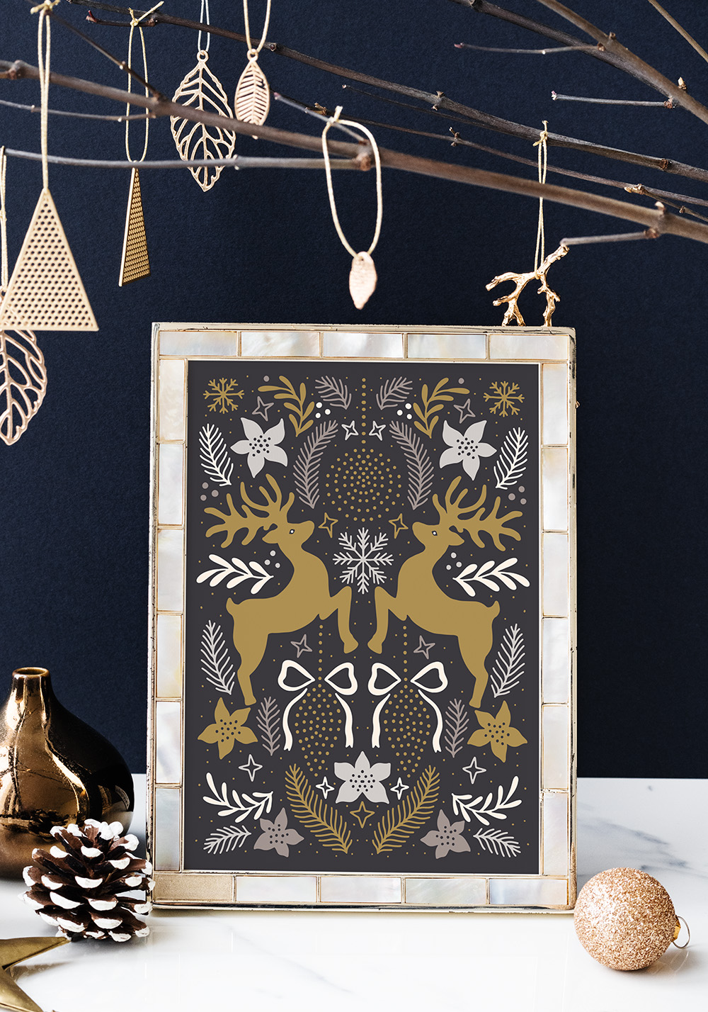 Ce poster festif est composé d’un fond marron foncé, sur lequel deux rennes trônent fièrement parmi des flocons de neige, des boules de Noël et des étoiles scintillantes. Autour d’eux, des feuilles et des fleurs blanches viennent apporter une touche de douceur et d’harmonie à la composition.